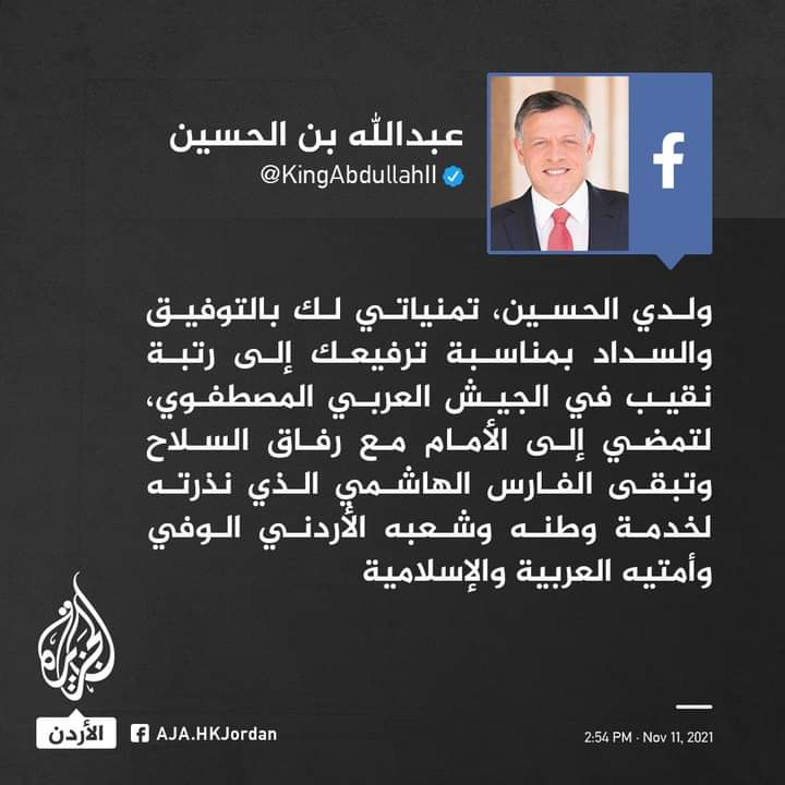 وكانت إرادة ملكية سامية صدرت في وقت سابق من اليوم، بترفيع سمو الأمير الحسين بن عبدالله الثاني إلى رتبة (نقيب)، وقام جلالة الملك عبدالله الثاني، القائد الأعلى للقوات المسلحة، بتقليد سموه الرتبة العسكرية الجديدة.