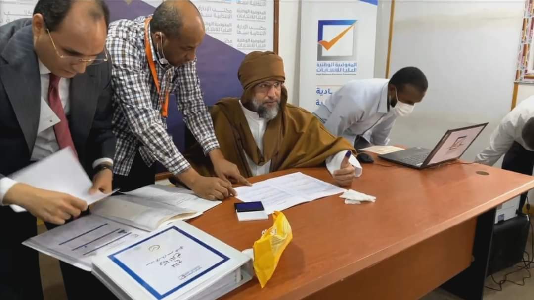 وظهر سيف الإسلام في صور منشورة على وسائل التواصل الاجتماعي بعمامة وعباءة تقليدية بنية اللون وبلحية رمادية ونظارة وهو يوقع وثائق في مركز التسجيل ضمن المرشحين بمدينة سبها بجنوب البلاد.