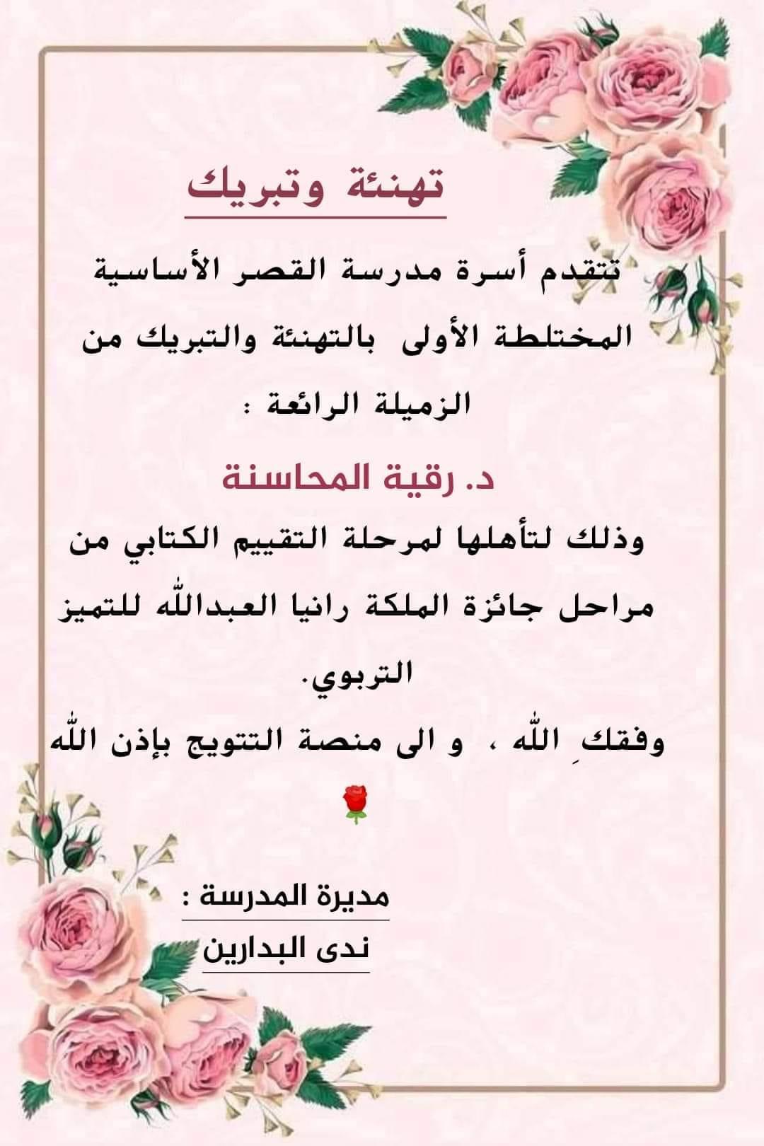 تتقدم اسرة مدرسة القصر الاساسية المختلطة الاولى بالتهنئة والتبريك من الدكتورة رقية المحاسنة وعائلتها .