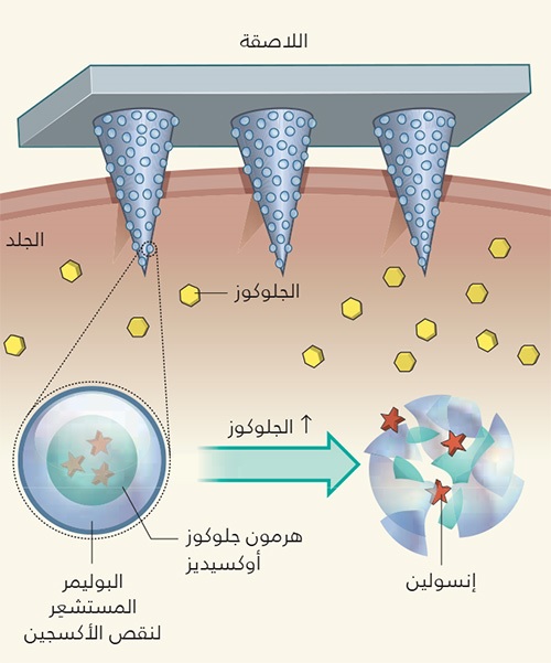 بلكي الإخباري يعتبر مرض السكري واحدًا من أكبر التحديات الطبية في القرن الواحد والعشرين، حيث يعاني منه أكثر من 280 مليون شخص على مستوى العالم1. ويجب على كل من هؤلاء مراقبة مستويات السكر في الدم لديهم، وحقن الجرعة الصحيحة من هرمون الإنسولين الخافض للجلوكوز؛ للحفاظ على مستويات السكر في معدلها الطبيعي2، لكن طريقة المعالجة تلك تشمل العديد من التحديات، فهي تتطلب حَقْنًا مؤلمًا ومزعجًا تحت الجلد، إضافة إلى أنها غير دقيقة، ويمكن أن تسبب مشكلات خطيرة، إذا لم يتم ضبط جرعة الإنسولين، حسب الاحتياجات الفسيولوجية الضرورية للمريض3. فقد قام يو وزملاؤه4 في بحثهم المنشور في دورية "أعمال الأكاديمية الوطنية للعلوم" بوصف لاصقة تحتوي على إبرة مجهرية تستجيب للجلوكوز، يمكن وضعها ـ من دون ألم ـ على الجلد؛ فتطلق الإنسولين عند ارتفاع مستويات السكر في الدم.
