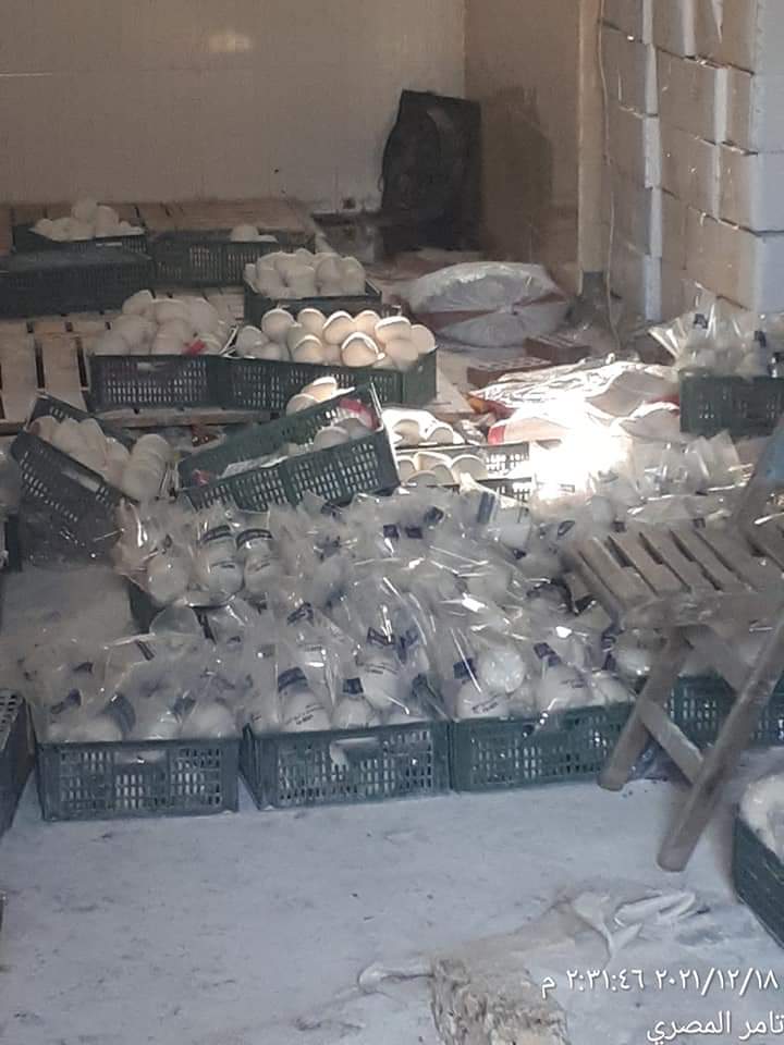 تم مداهمة مصنع لتصنيع الجبن وضبط 40500 قطعة جبن غير صالحة للاستهلاك الآدمي بإجمالي 14 طن، 5شيكارة معجون حوائط زنة 15 ك، 198كيس جبن زنة الواحدة 50 ك بإجمالي 10طن بياناتها 10 برميل زنة البرميل 500 ك جبن بدون بيانات، 10 آلاف مطبوع مستخدم، 2 طن ملح منتهي الصلاحية و370 كرتونة زنه الكرتونة 15 ك بإجمالي يزن 5500 ك جبن غير صالح .