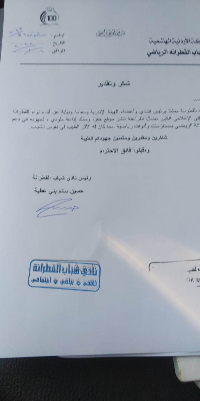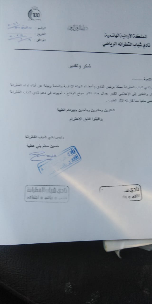 قدم نادي شباب لواء القطرانة بمحافظة الكرك الشكر والتقدير والعرفان للاعلاميان الكبيران نضال الفراعنة - ناشر موقع جفرا . وجمال حداد - ناشر موقع الوقائع على دعمهم السخي للنادي .