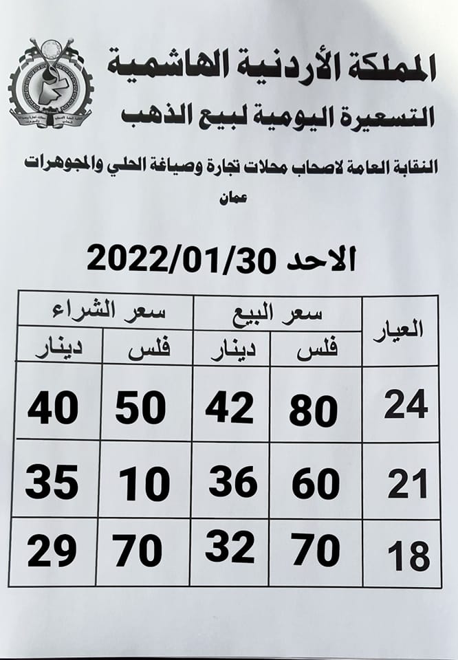 وحسب النقابة العامة لأصحاب محلات تجارة وصياغة الحلي والمجوهرات فقد بلغ سعر بيع الغرام الواحد من الذهب عياري 24 و18 لغايات الشراء من محلات الصاغة عند 42.8 دينارا، و32.7 ديناراً على التوالي.