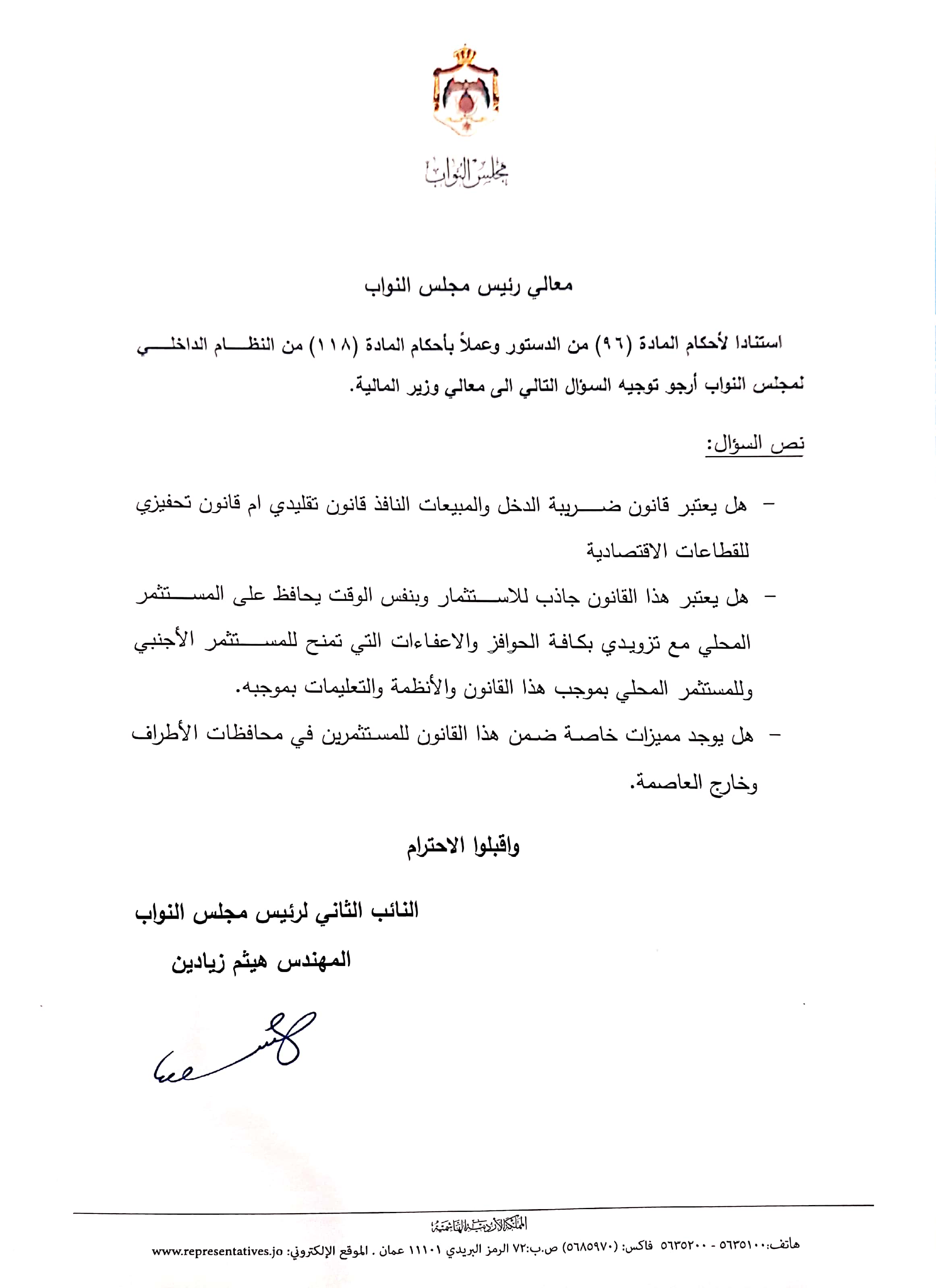 كما وجه الزيادين للعسعس سؤالا حول قانون ضريبة الدخل والمبيعات النافذ حاليا متسائلا هل يعتبر هذا القانون تقليدي ام تحفيزي للقطاعات الاقتصادية ؟ وهل يعتبر ايضا جاذب للاستثمار الخارجي ويحافظ بذات الوقت على المستثمر المحلي من ترك السوق الاردني والهروب للخارج ؟ مطالبا بتزويده بالإعفاءات والحوافز التي تمنح للمستثمر من الخارج والمستثمر المحلي بموجب هذا القانون .