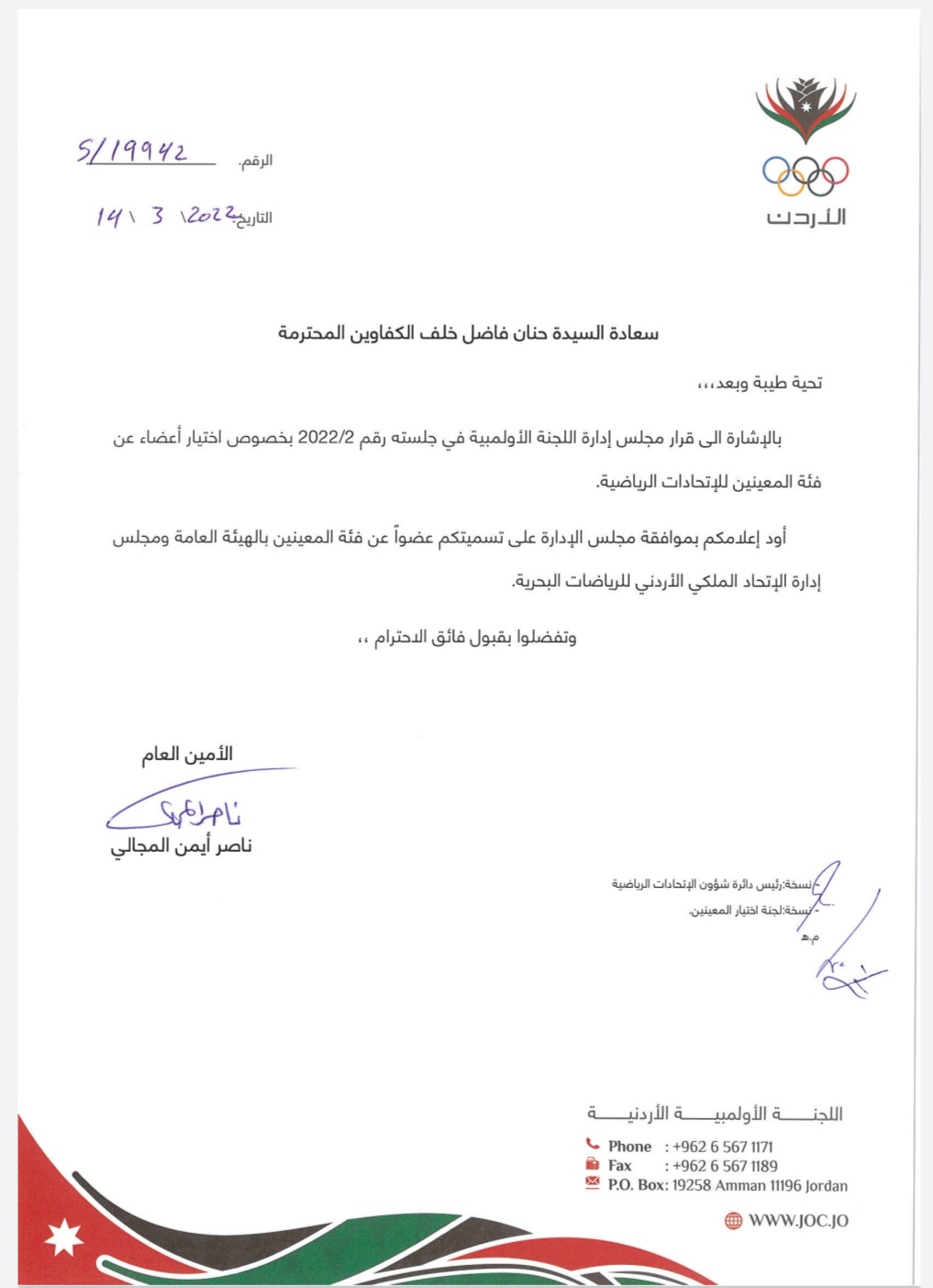 تسمية الصحفية حنان الكفاوين رئيسة تحرير بلكي نيوز عضوا بالهيئة العامة ومجلس ادارة الاتحاد الملكي للرياضات البحرية .