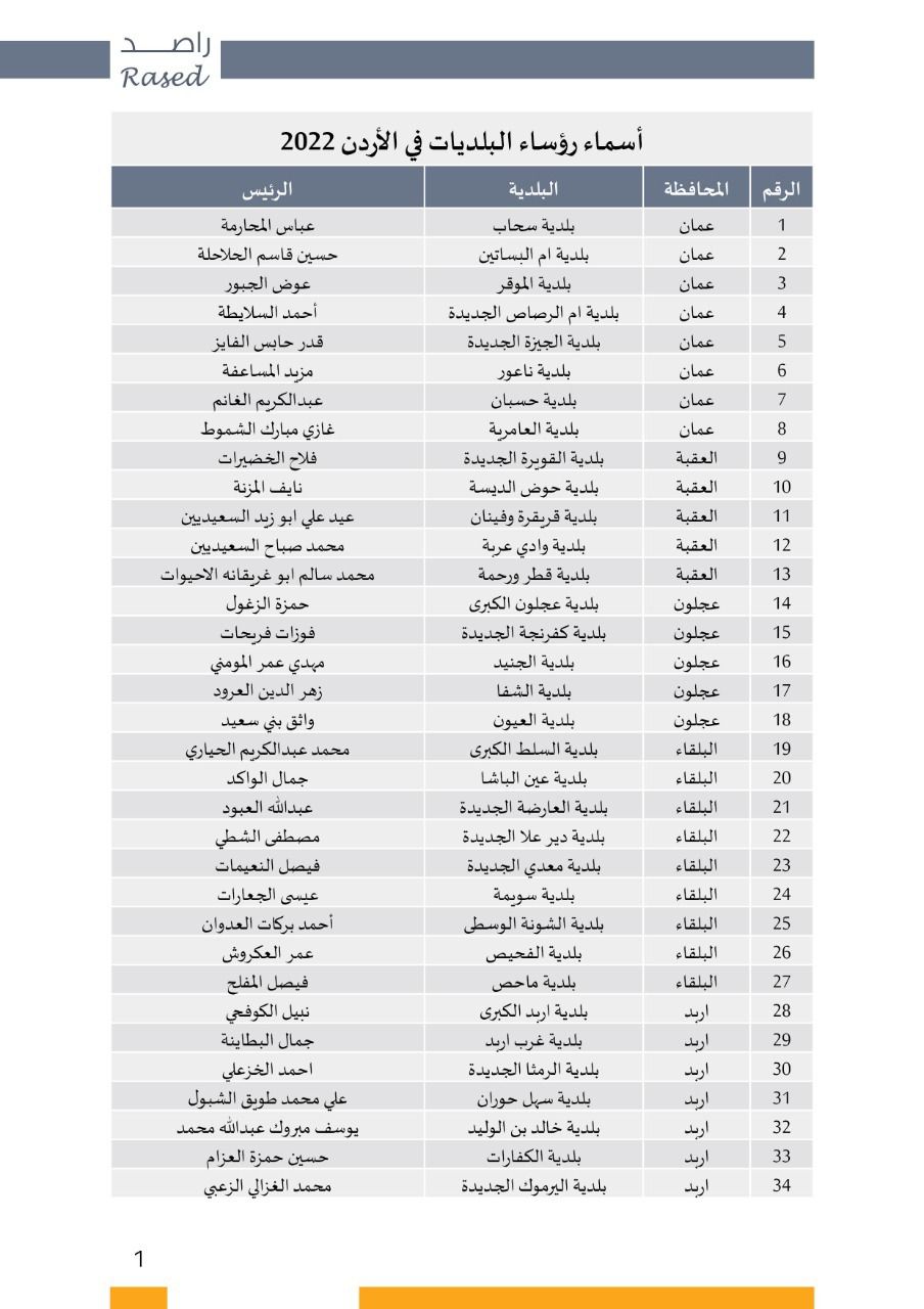 فيما لم تعلن الهيئة المستقلة للانتخاب بعد، النتائج النهائية للانتخابات، أعلن مركز راصد، اليوم الأربعاء، أسماء الفائزين بمقعد رؤساء البلديات في كافة محافظات المملكة.