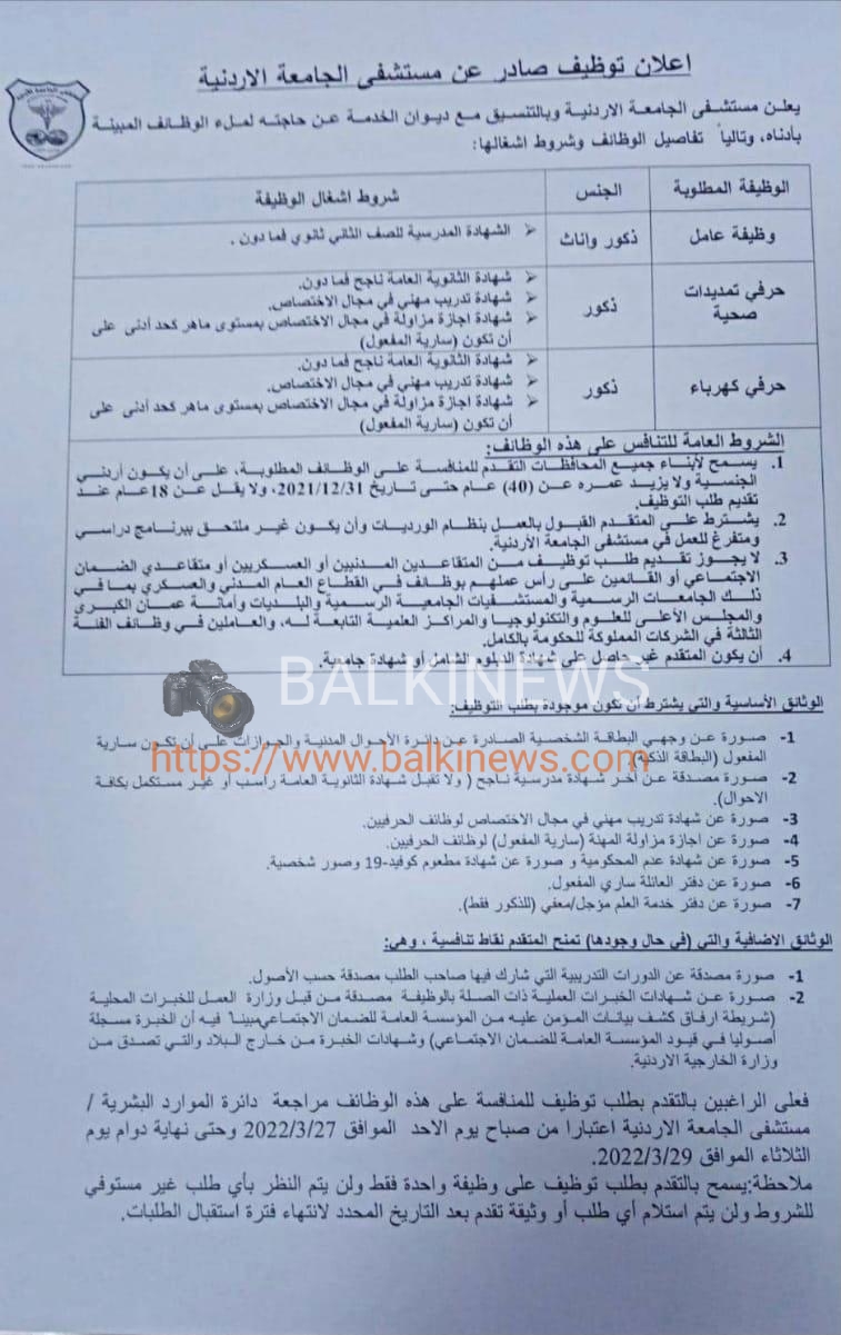مستشفى الجامعة الاردنية يعلن عن وظائف شاغرة بشرط توجيهي فما دون .