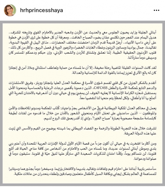 اعلنت الاميرة هيا الحسين انتهاء جلسات المحكمة الخاصة بالتفريق بينها وبين حاكم دبي وقدمت الشكر لشقيقها الملك عبدالله الثاني وشقيقها الامير علي بن الحسين لما قدماه من دعم لها خلال السنوات الماضية وتاليا نص البيان