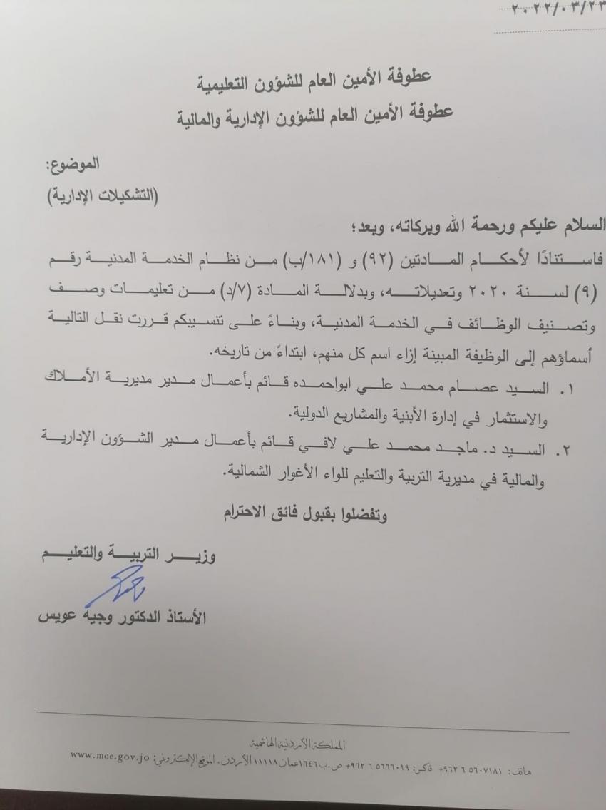 قرر وزير التربية والتعليم الدكتور وجيه عويس إجراء تشكيلات إدارية واسعة بين الموظفين في الوزارة.
