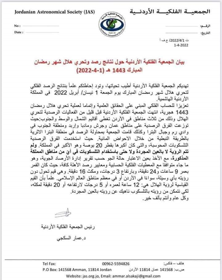 أصدرت الجمعية الفلكية الأردنية بيانا حول نتائج رصد وتحري هلال شهر رمضان المبارك، أكدت فيه عدم رؤية هلال رمضان لا بالعين المجردة ولا بالتلسكوبات المتوفرة في أقاليم الأردن الثلاثة من قبل المتراؤون