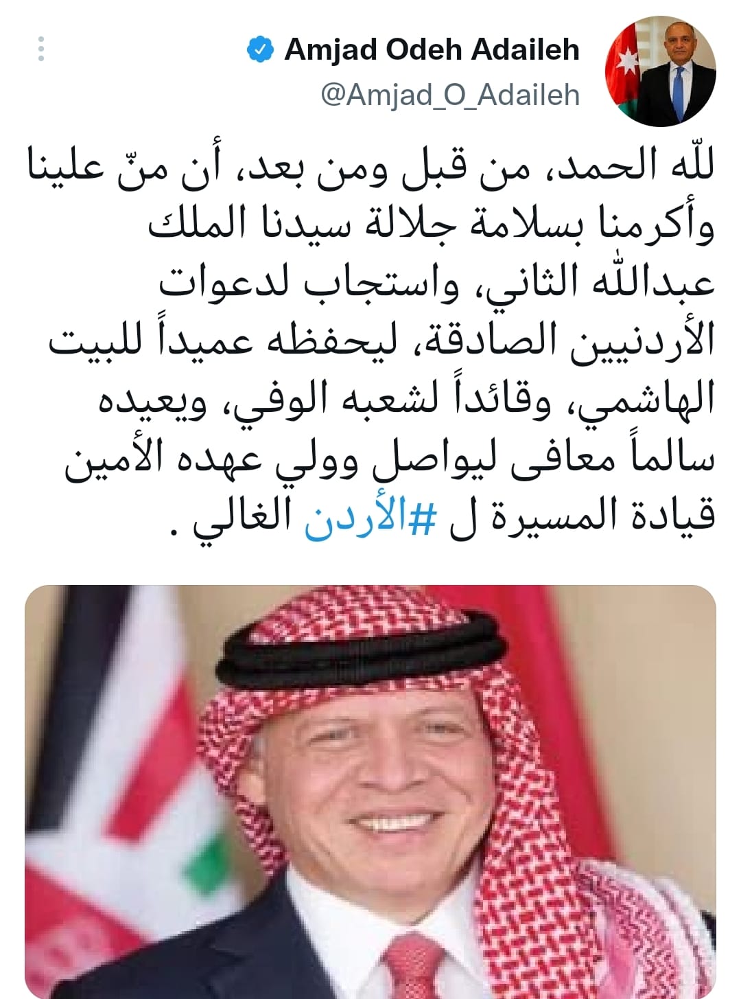 وقال العضايلة، في تغريدة له على حساباته على مواقع التواصل الاجتماعي، "للّه الحمد، من قبل ومن بعد، أن منّ علينا وأكرمنا بسلامة جلالة سيدنا الملك عبدالله الثاني، واستجاب لدعوات الأردنيين الصادقة، ليحفظه عميداً للبيت الهاشمي، وقائداً لشعبه الوفي، ويعيده سالماً معافى ليواصل وولي عهده الأمين قيادة المسيرة ل #الأردن الغالي".