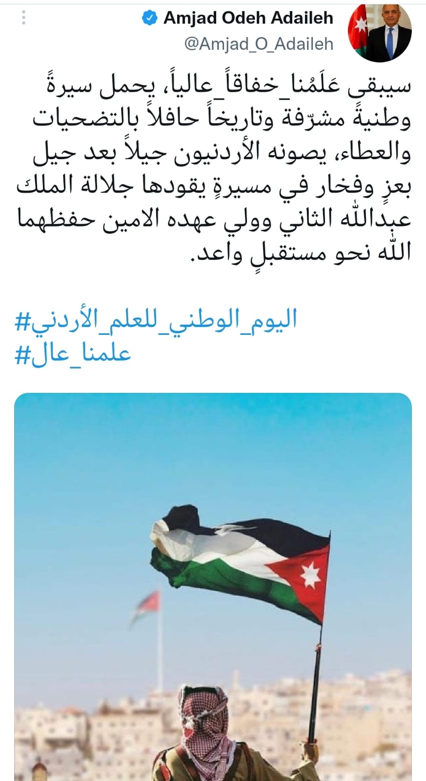 وقال العضايلة، في تغريدة له على حسابه الشخصي على موقع التواصل الاجتماعي تويتر، "سيبقى عَلَمُناخفاقاًعالياً، يحمل سيرةً وطنيةً مشرّفة وتاريخاً حافلاً بالتضحيات والعطاء، يصونه الأردنيون جيلاً بعد جيل بعزٍ وفخار في مسيرةٍ يقودها جلالة الملك عبدالله الثاني وولي عهده الامين حفظهما الله نحو مستقبلٍ واعد".