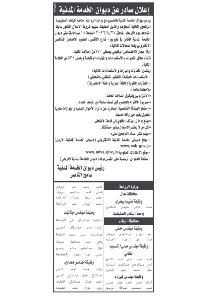 نشر ديوان الخدمة المدنية إعلانا اليوم الأربعاء دعا من خلاله وبالتنسيق مع وزارة الزراعة وجامعة البلقاء التطبيقية، مرشحين لحضور الامتحان التنافسي الإلكتروني يوم الأربعاء الموافق 27/4/2022 في تمام الساعة 11 صباحا في مبنى ديوان الخدمة المدنية .