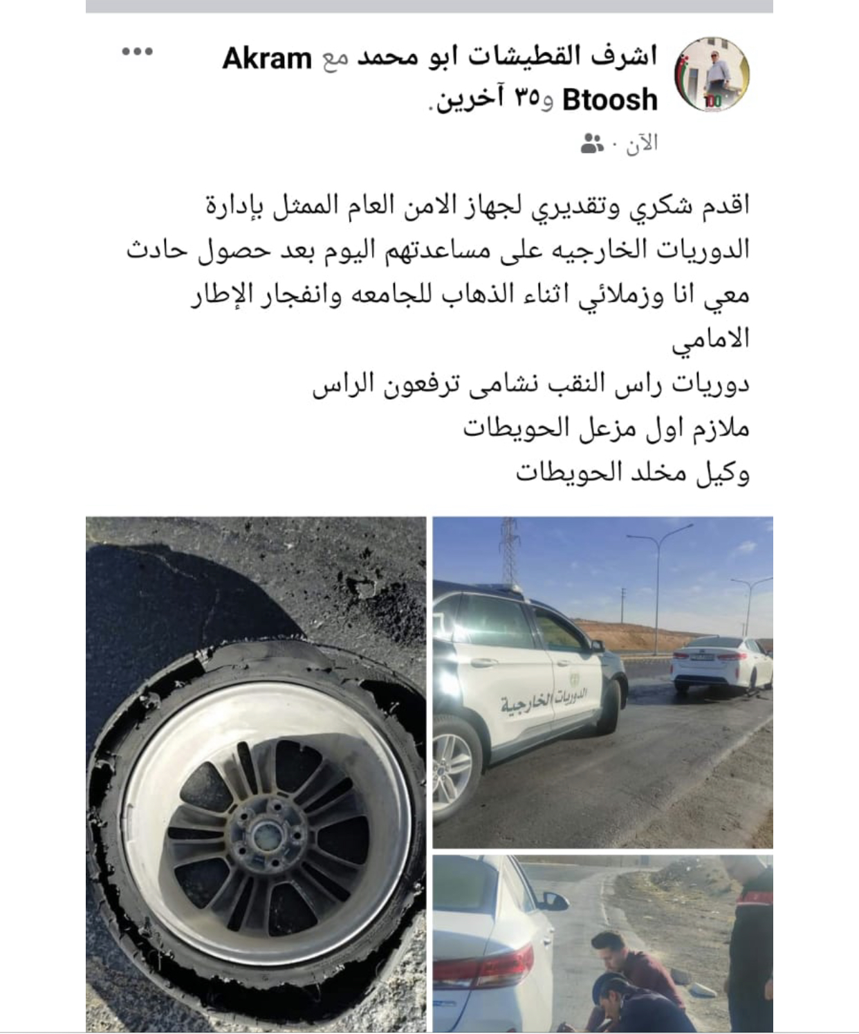على حسن التعامل وحس المسؤولية اثناء انفجار العجل الامامي في راس النقب وتقديم المساعده والخدمه وهذا يدل على الاداره الناجحه وحسن الاخلاق.