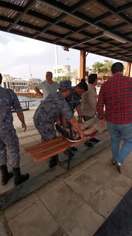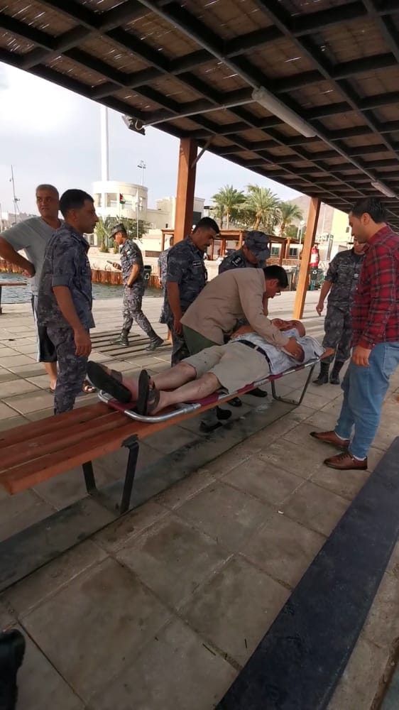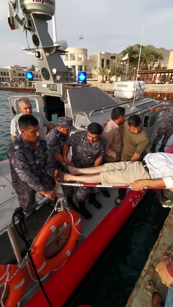 وتحرك على الفور فريق انقاذ بحري مكون من زورق إسعاف ودورية بحرية، حيث تم اجراء الإسعافات الأولية له على متن زورق الاسعاف التابع للقوة البحرية وتم نقله بعد ذلك الى مستشفى الامير هاشم بن عبدالله الثاني وحالته الصحية جيدة .
