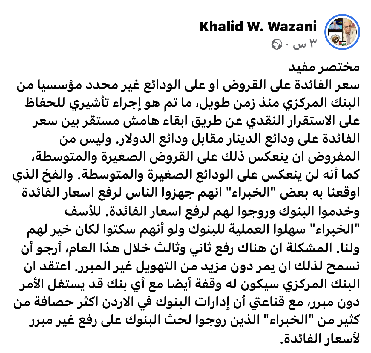د.خالد الوزني : بعض الخبراء خدموا البنوك وجهزوا المقترضين لرفع اسعار الفائدة عليهم