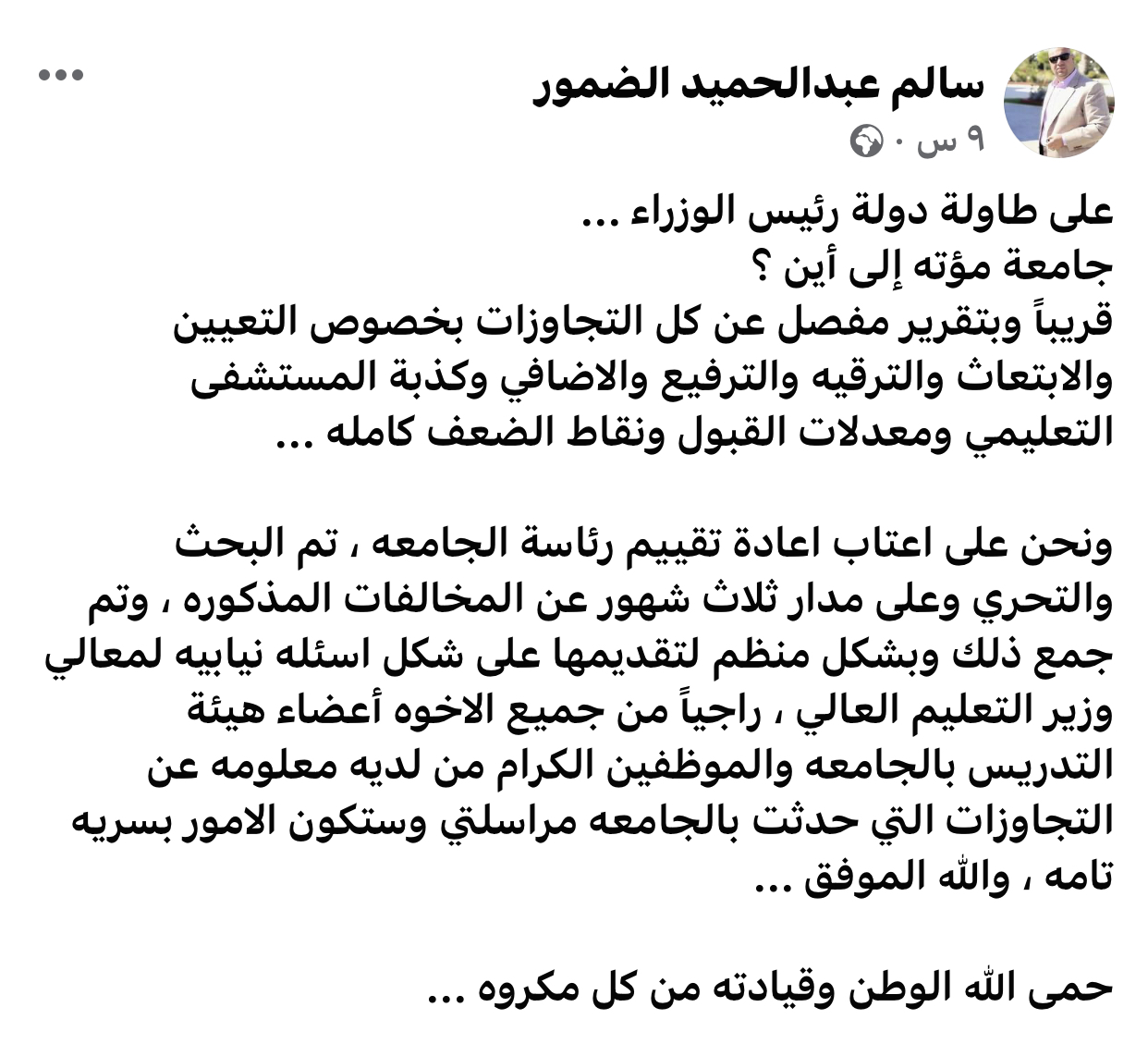ونحن على اعتاب اعادة تقييم رئاسة الجامعه ، تم البحث والتحري وعلى مدار ثلاث شهور عن المخالفات المذكوره ، وتم جمع ذلك وبشكل منظم لتقديمها على شكل اسئله نيابيه لمعالي وزير التعليم العالي ، راجياً من جميع الاخوه أعضاء هيئة التدريس بالجامعه والموظفين الكرام من لديه معلومه عن التجاوزات التي حدثت بالجامعه مراسلتي وستكون الامور بسريه تامه ، والله الموفق …
