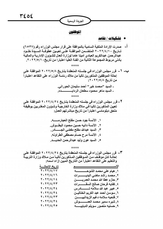 صدر في عدد الجريدة الرسمية اليوم الإثنين قرارت مجلس الوزراء بإحالة موظفين حكوميين الى التقاعد، وانهاء خدمات اخرين.