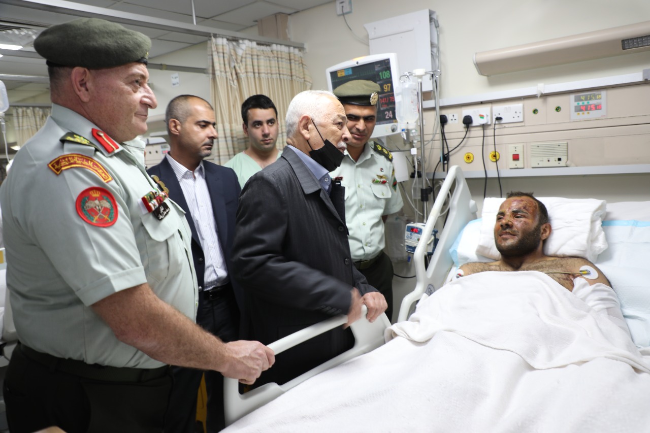 واستمع العيسوي، بحضور مدير عام الخدمات الطبية الملكية العميد الطبيب يوسف جمال زريقات، إلى شرح من رئيس اختصاص الجراحة العامة العميد الطبيب سمير الصمادي، عن الحالة العامة للمصابين الذين يستدعي علاجهم عدة أيام في المستشفى، حيث أنهم يعانون من حروق خفيفة في الوجه وجروح بسيطة في الساقين وحالتهم العامة جيدة.