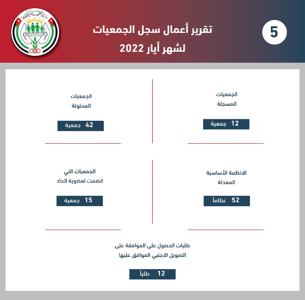 وفيما يتعلق بالسجل العام للجمعيات، قال خريس إنه تم تسجيل 12 جمعية، وحل 42 أخرى، فيما انضمت 15 جمعية لعضوية اتحاد، وجرت الموافقة على 52 نظاما أساسيا معدلا، وتم الموافقة على 12 طلبا للحصول على التمويل الأجنبي.