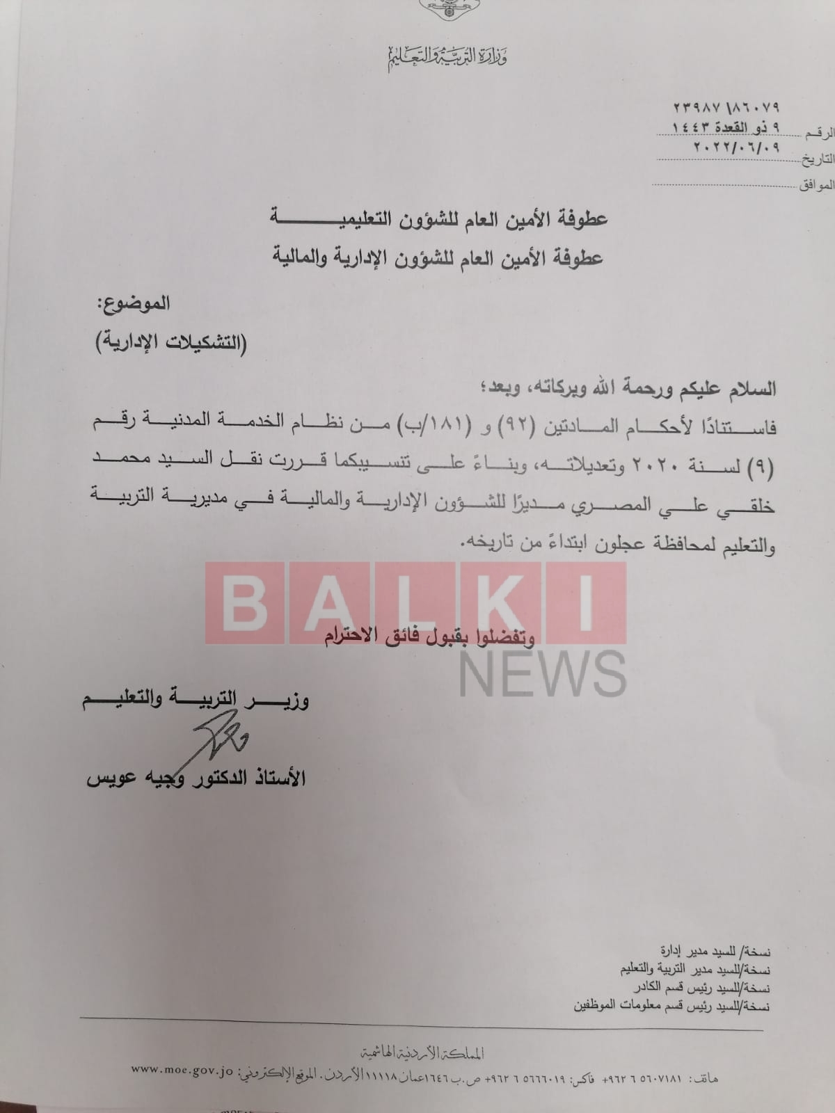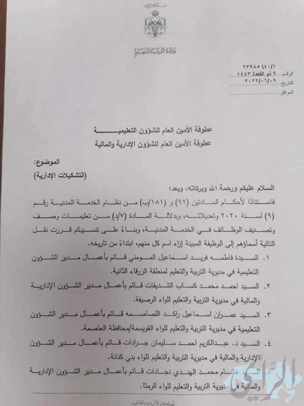تشكيلات إدارية في وزارة التربية والتعليم "تفاصيل"