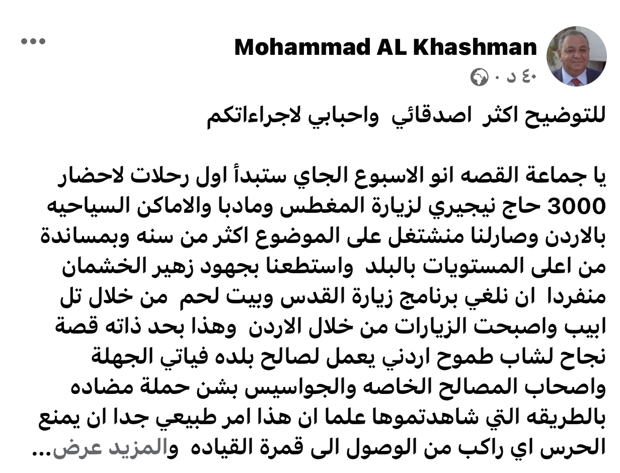 يا جماعة القصه انو الاسبوع الجاي ستبدأ اول رحلات لاحضار 3000 حاج نيجيري لزيارة المغطس ومادبا والاماكن السياحيه بالاردن وصارلنا منشتغل على الموضوع اكثر من سنه وبمساندة من اعلى المستويات بالبلد واستطعنا بجهود زهير الخشمان منفردا ان نلغي برنامج زيارة القدس وبيت لحم من خلال تل ابيب واصبحت الزيارات من خلال الاردن وهذا بحد ذاته قصة نجاح لشاب طموح اردني يعمل لصالح بلده فياتي الجهلة واصحاب المصالح الخاصه والجواسيس بشن حملة مضاده بالطريقه التي شاهدتموها علما ان هذا امر طبيعي جدا ان يمنع الحرس اي راكب من الوصول الى قمرة القياده وهذا سبب وجودهم على الطائره - اعتقد ان الاغبياء اللذين سوقوا الفيديو لا تهمهم الاردن او اقتصاده او مصالحه الوطنيه ايا كانت
