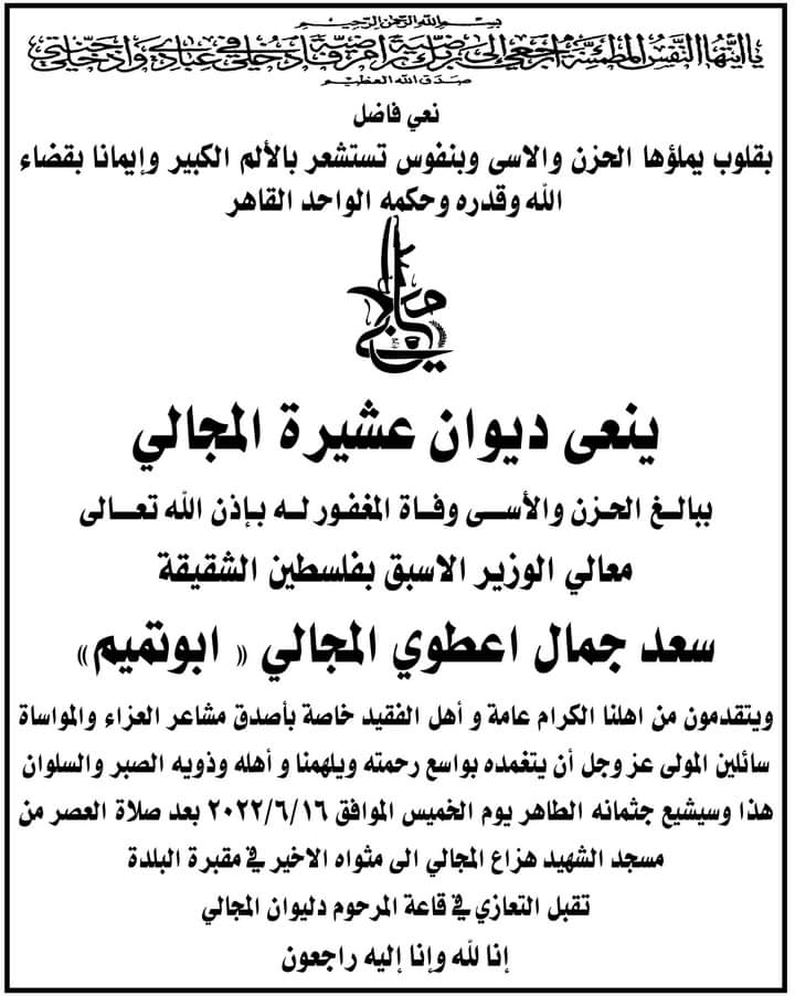 انتقل إلى رحمه الله تعالى الوزير الأسبق في السلطة الوطنية الفلسطينية سعد جمال المجالي.