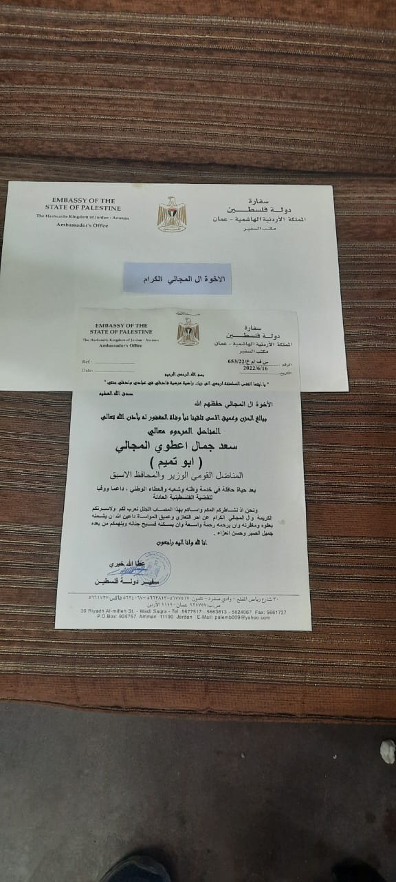 أجرى الرئيس الفلسطيني محمود عباس، اتصالا مع تميم المجالي، اليوم الخميس. بالتعازي في وفاة والده، الوزير والمحافظ الأسبق، المناضل الوطني سعد جمال المجالي. الذي وافته المنية يوم أمس الأربعاء، إثر حادث سير في الأردن.