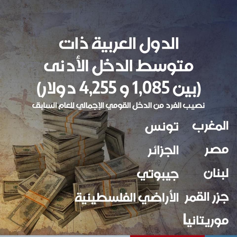 باقي الدول العربية أغلبها في فئة دخل متوسط أدنى كالمغرب، مصر، لبنان، موريتانيا، جزر القمر، تونس، الجزائر، جيبوتي والأراضي الفلسطينية.