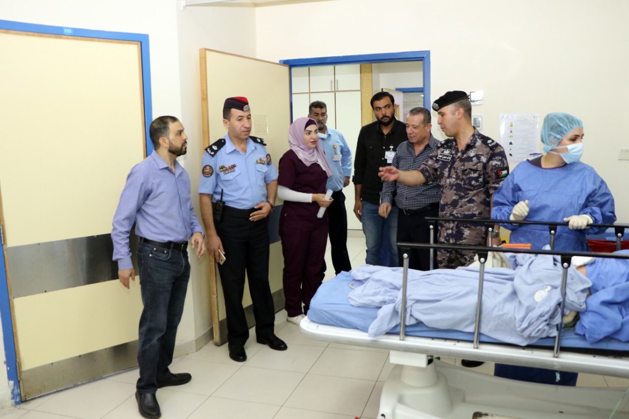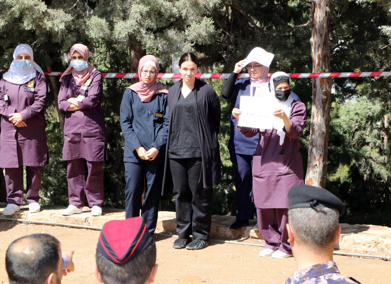 وعبّر فريق المُقيّمين لفعاليّات التمرين ممثّلاً بالرائد أحمد القضاة والرائد حازم الجمل والملازم علي الحوامدة، عن إعجابهم بالمستوى المتطور الذي يتمتّع به كادر المستشفى في التعامل مع الحالات الطارئة الذي ظهر جليّاً من خلال تنفيذهم للتمرين الذي استغرق حوالي (دقيقة و46 ثانية).