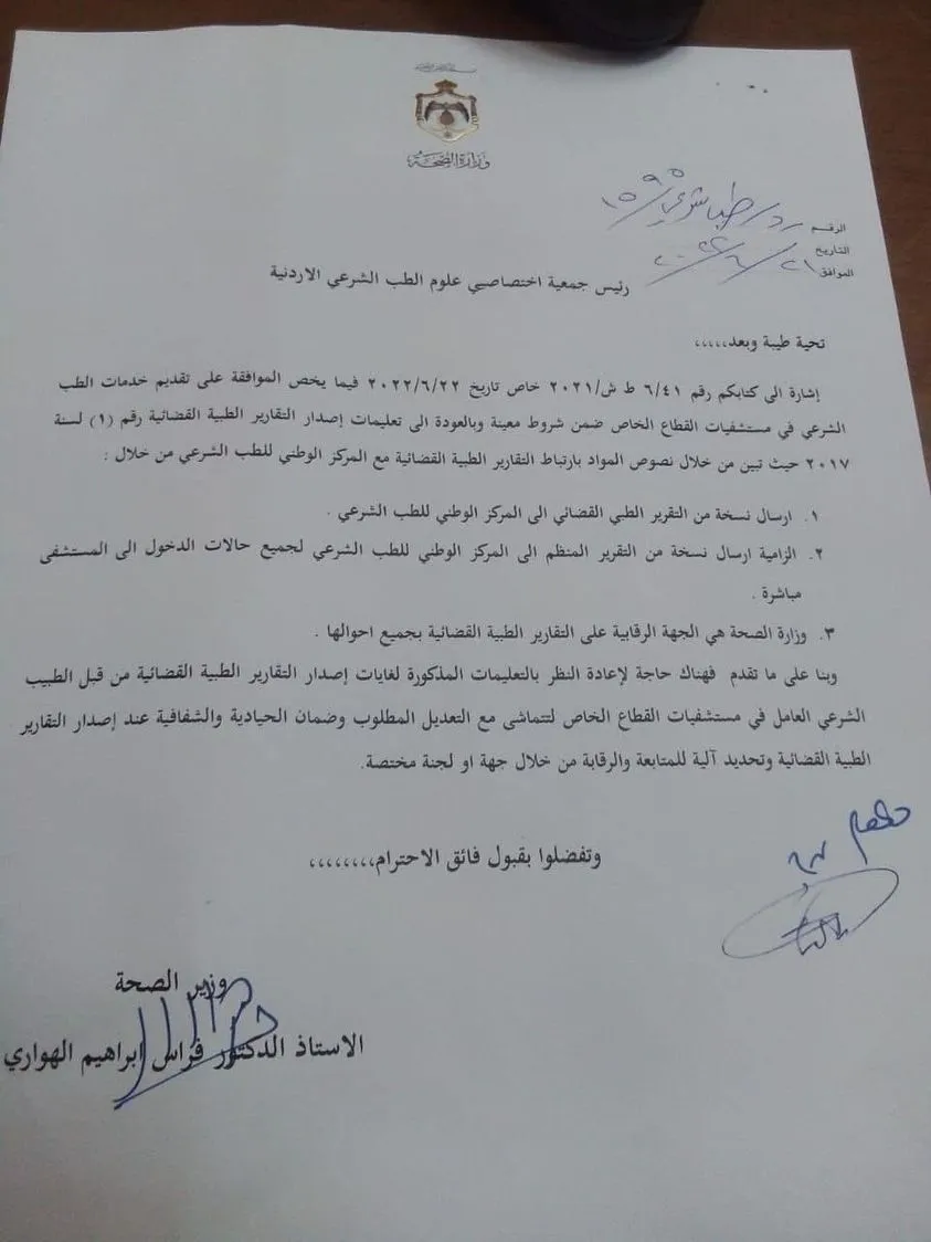 لم يقف هذا هنا بل المفاجأة الصاعقة التي تخطت كل شيء بإرسال وزير الصحة كتاب رسمي إلى جمعية الطب الشرعي يطالبهم بإعادة النظر بتعليمات إصدار تقارير الطب الشرعي القضائية لغايات إصدارها من خلال الطبيب الشرعي في المستشفيات الخاصة و سلب هذه الصفة من القطاع العام ليؤكد ما قلناه و نقوله بأن هذا الوزير يعمل فقط للقطاع الخاص و يريد خصخصة القطاع الصحي العام و تجريده من كل صلاحياته الرسمية خاصة في يتعلق حتى بالأمور القضائية العدلية و هذه سابقة خطيرة جدا جدا توجب فورا إقالته و تعيين وزيرا للصحة من قلب القطاع العام أو الخدمات الطبية الملكية .