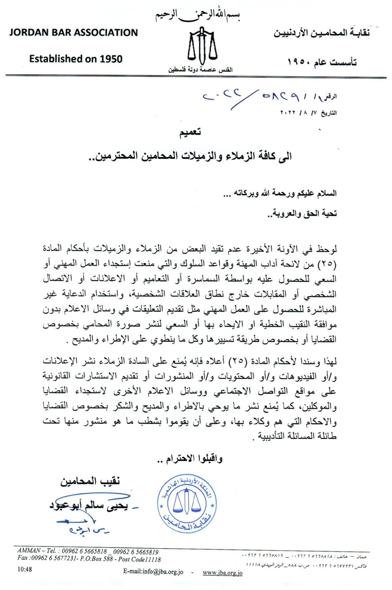 عممت نقابة المحامين الأردنيين على المحامين بمنع نشر اي فيديوهات او محتويات او منشورات او تقديم استشارة قانونية عبر مواقع التواصل ووسائل الاعلام لاستجداء القضايا والموكلين، داعية الى شطب هذه المنشورات تحت طائلة المساءلة التأديبية.