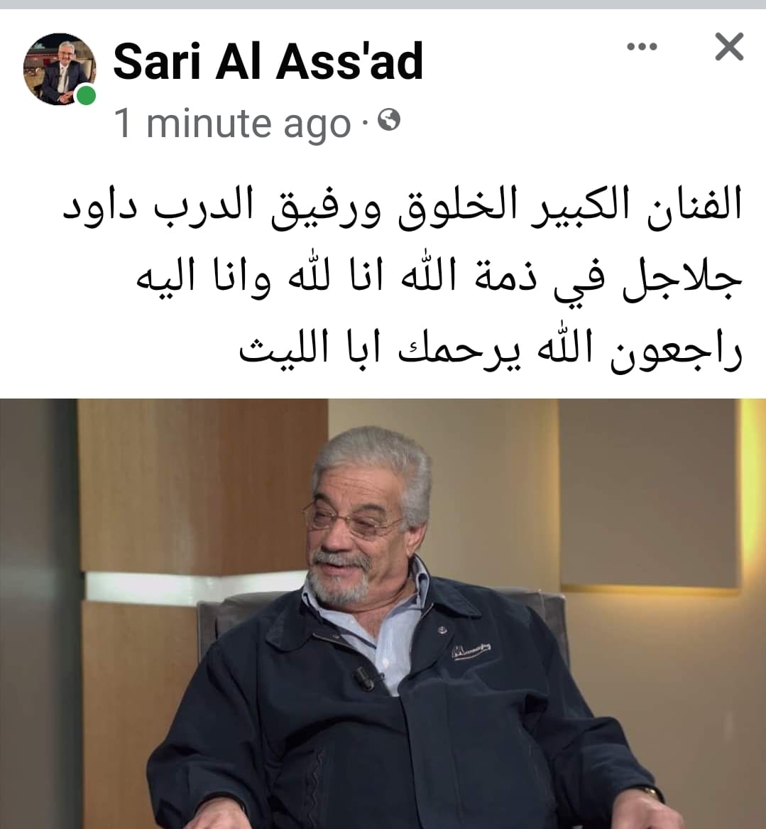 نشر نقيب الفنانين السابق ساري الأسعد عبر صفحته على الفيسبوك خبراً نعى فيه الفنان الكبير داود جلاجل.