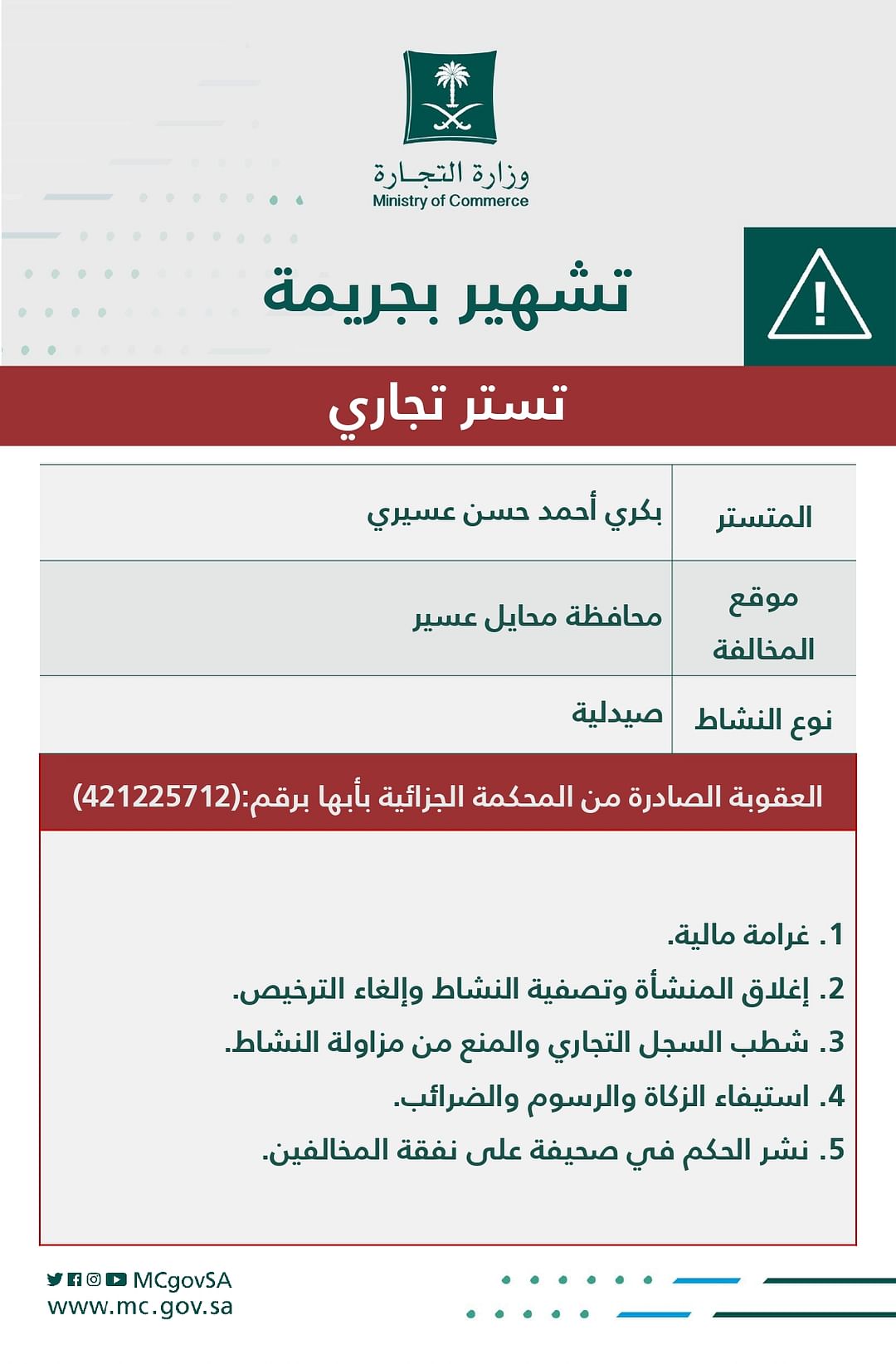 شهّرت وزارة التجارة بمواطن سعودي بعد صدور حكم قضائي بإدانته بارتكاب جريمة التستر على مقيم من جنسية هندية لمزاولة نشاط التجارة في قطاع الصيدليات عبر 5 فروع بمحافظة محايل عسير.