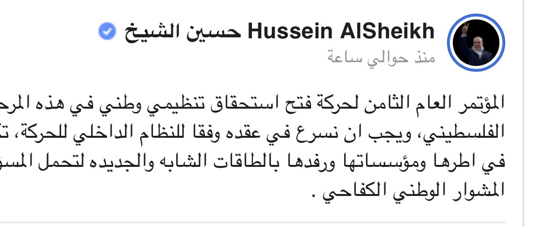 وكتب الشيخ عبر صفحته على "فيسبوك"، أنّ المؤتمر العام الثامن لحركة فتح استحقاق تنظيمي وطني في هذه المرحلة من العمل الوطني الفلسطيني.