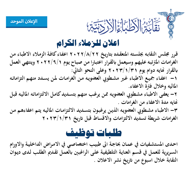 قرر مجلس نقابة الاطباء الاردنيين ، اليوم السبت ، اعفاء كافة الاطباء المترتبة عليهم غرامات للنقابة ، حيث سيدخل القرار حيز التنفيذ في بداية ايلول المقبل وحتى نهاية شهر كانون اول من العام القادم .