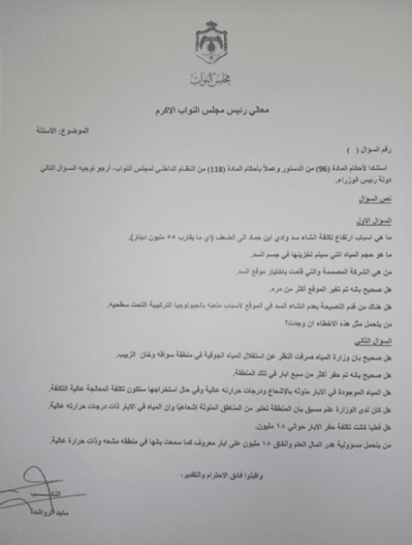 ووجه الرواشدة سؤالاً لرئيس الوزراء الخصاونة حول هل صرفت وزارة المياه النظر عن استغلال المياه الجوفية في منطقة سواقة وخان الزبيب؟