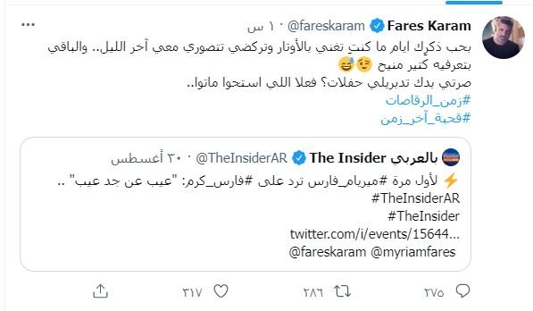 الفنان فارس كرم للفنانة ميريام فارس عبر تويتر : بحب ذكرِك ايام ما كنتِ تركضي تتصوري معي آخر الليل.. والباقي بتعرفيه كتير منيح، فعلا اللي استحوا ماتوا..». «نسيتي نفسك» !