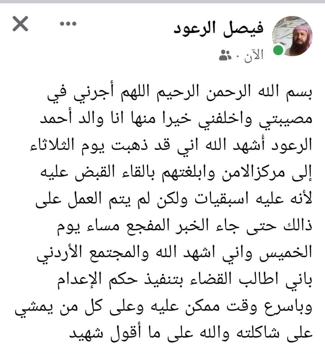 وأضاف: "أشهد الله والمجتمع الأردني بأني أطالب القضاء بتنفيذ حكم الإعدام وبأسرع وقت ممكن عليه وعلى كل يمشي على شاكلته".