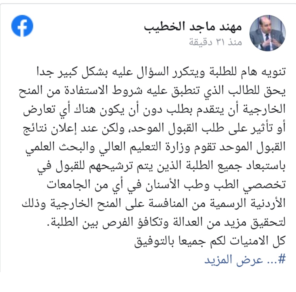 وأشار الخطيب في منشور له عبر مواقع التواصل الى انه عند إعلان نتائج القبول الموحد تقوم وزارة التعليم العالي والبحث العلمي باستبعاد جميع الطلبة الذين يتم ترشيحهم للقبول في تخصصي الطب وطب الأسنان في أي من الجامعات الأردنية الرسمية من المنافسة على المنح الخارجية وذلك لتحقيق مزيد من العدالة وتكافؤ الفرص بين الطلبة.