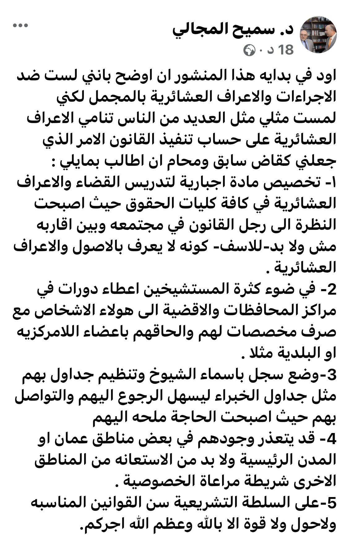 اود في بدايه هذا المنشور ان اوضح بانني لست ضد الاجراءات والاعراف العشائرية بالمجمل لكني لمست مثلي مثل العديد من الناس تنامي الاعراف العشائرية على حساب تنفيذ القانون الامر الذي جعلني كقاض سابق ومحام ان اطالب بمايلي :