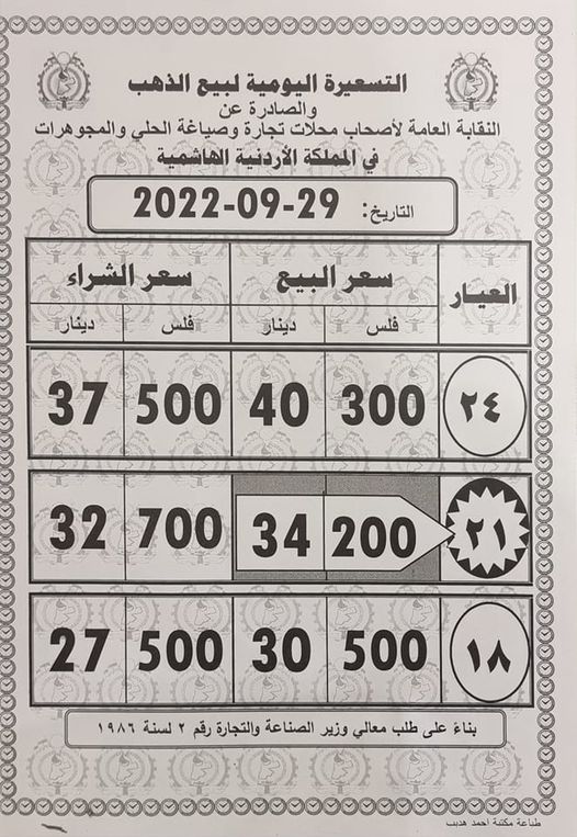 فقد بلغ سعر بيع غرام الذهب عيار 21 الأكثر رغبة من الأردنيين بالسوق المحلية 34,20 دينارا لغايات شراء المواطنين من محلات الصاغة.
