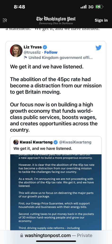 رئيسة وزراء بريطانيا: “فهمناكم ونحن نستمع لكم”. هذا ما قالته حين انهار الجنيه الاسترليني مقابل الدولار عقب اعلان خطة حكومية لتخفيض الضرائب على اصحاب الدخل المرتفع. حكومات تستمع!