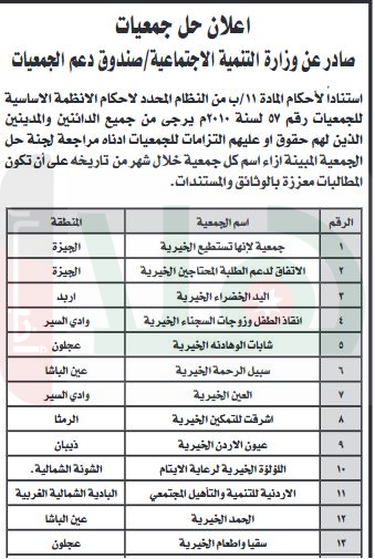 ودعت وزارة التنمية، الدائنين والمدينين الذين لهم حقوق أو عليهم التزامات للجمعيات أناه مراجعة لجنة حلّ الجمعية المبينة إزاء كل جمعية خلال شهر من تاريخه.