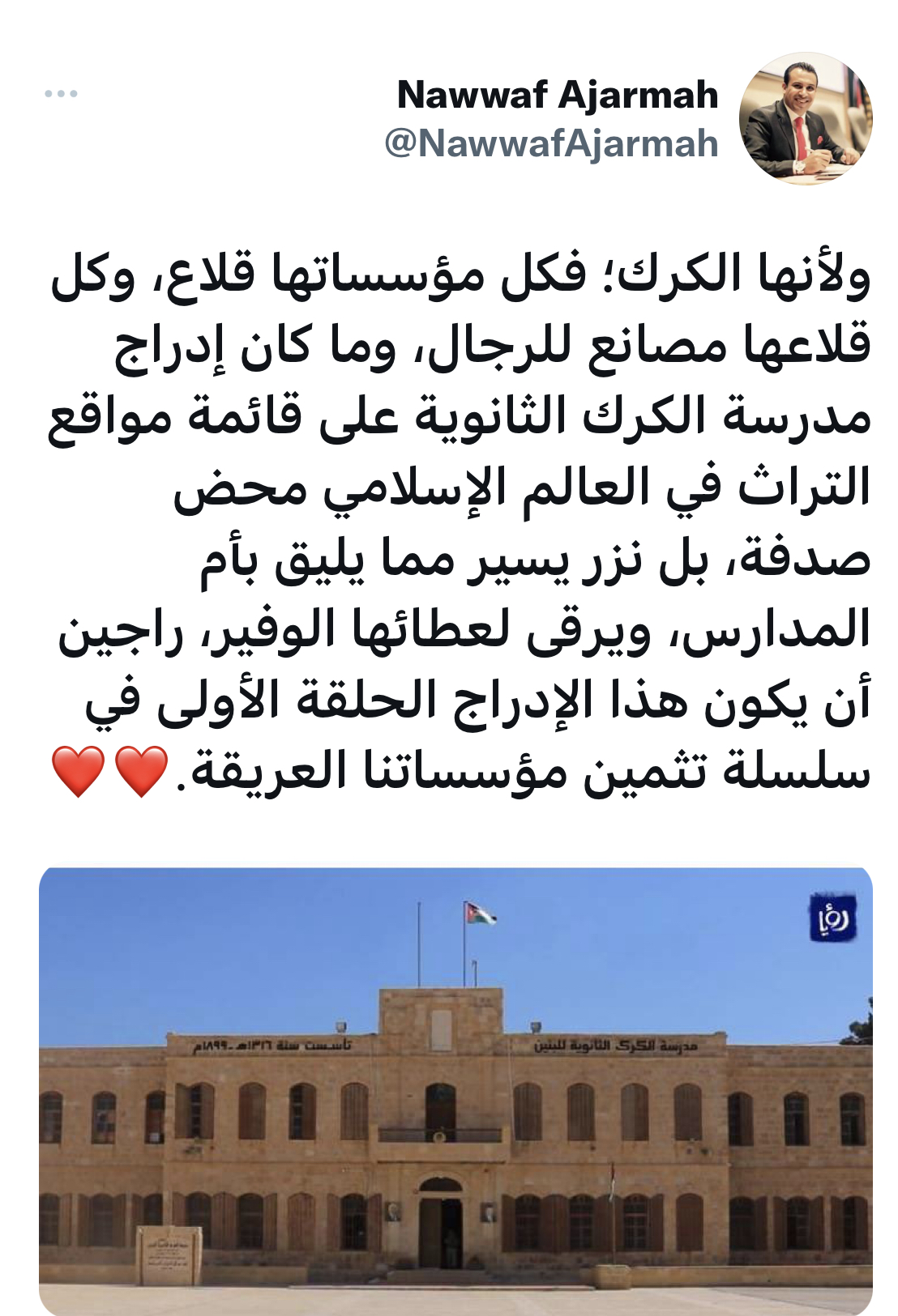العجارمة :لم يكن إدراج مدرسة الكرك الثانوية على قائمة مواقع التراث قي العالم الإسلامي محض صدفة ،