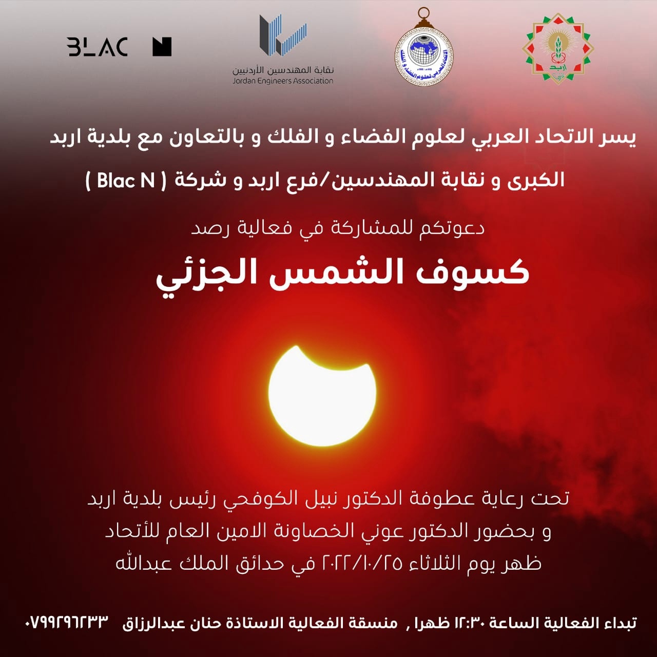 أعلن الاتحاد العربي لعلوم الفضاء والفلك عن تنظيم فعاليات ومخيمات خاصة برصد الكسوف الجزئي للشمس ي في مناطق مختلفة في الدول العربية والإسلامية منها الأردن، برعاية عطوفة الدكتور نبيل الكوفحي رئيس بلدية اربد ونقابة المهندسين الأردنيين فرع اربد، وبحضور الدكتور عوني الخصاونة الأمين العام للاتحاد ظهر يوم الثلاثاء القادم الموافق للخامس والعشرين من الشهر الحالي في حدائق الملك عبد الله في مدينة اربد.
