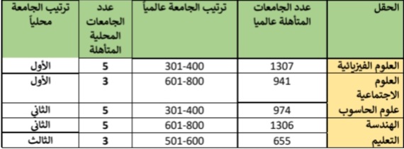 كما استطاعت الجامعة الحفاظ على ترتيبها في المرتبة الثالثة محليا وضمن الفئة (801-1000) لأفضل ما يزيد عن 2000 جامعة على مستوى العالم تأهلت لتصنيف التايمز العالمي والذي أعلن الأربعاء 12/10/2022.