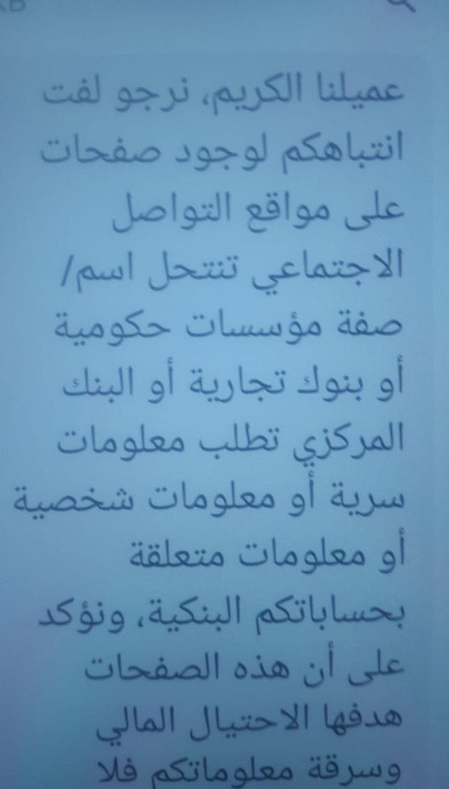 وصل للمواطنين رسالة تحذيرية من بنوك تفيد بوجود جهات على مواقع التواصل الاجتماعي تنتحل صفة البنك المركزي والبنوك التجارية والجهات الحكومية.