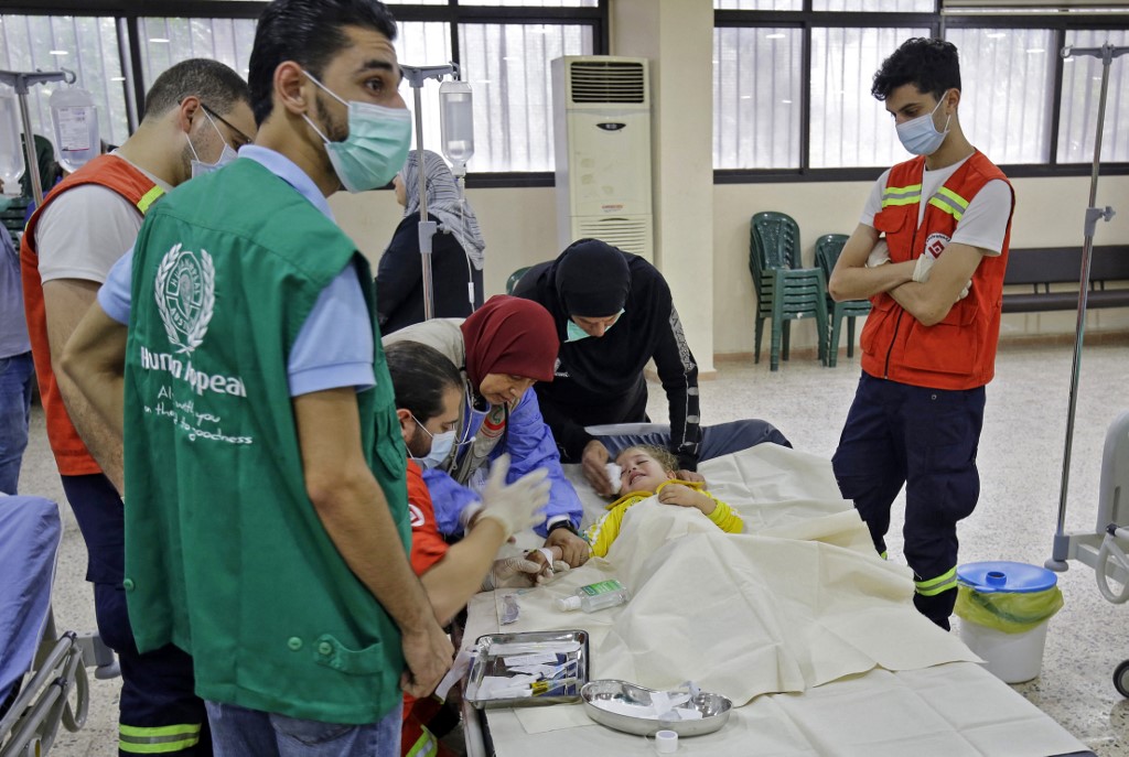 (FILES) In this file photo taken on October 26, 2022, medical staffers attend to a child patient being treated in an outbreak of Vibrio cholera at a ward in a mosque hall converted into a field hospital in the town of Bebnine in the Akkar district in north Lebanon. - Last month Lebanon recorded its first cholera case since 1993, in the nearby Syrian refugee camp of Rihaniye, weeks after an outbreak in Syria, which lies about 20 kilometres (12 miles) away. Over a quarter of the country';s more than 400 recorded cases are from Bebnine, where people resort to unsafe water sources as the state fails to provide clean water. (Photo by Ibrahim Chalhoub / AFP)