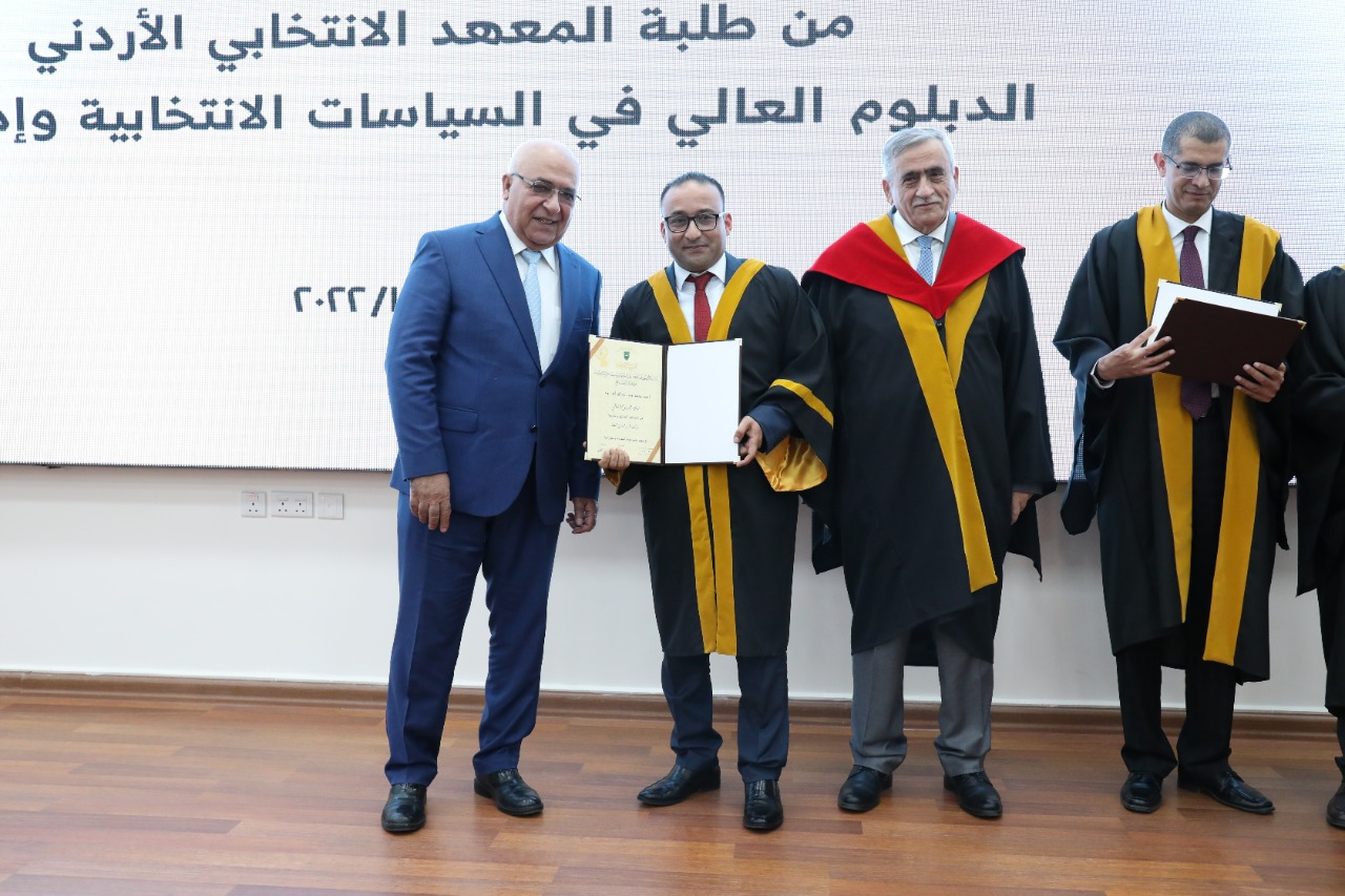 احتفلت الهيئة المستقلة للانتخاب اليوم بتخريج الفوج الأول من طلبة الدبلوم العالي في السياسات الانتخابية وادارتها، من المعهد الانتخابي الأردني، وذلك بحضور رئيس مجلس مفوضي الهيئة المستقلة للانتخاب، المهندس موسى المعايطة ورئيس الجامعة الأردنية الأستاذ الدكتور نذير عبيدات.
